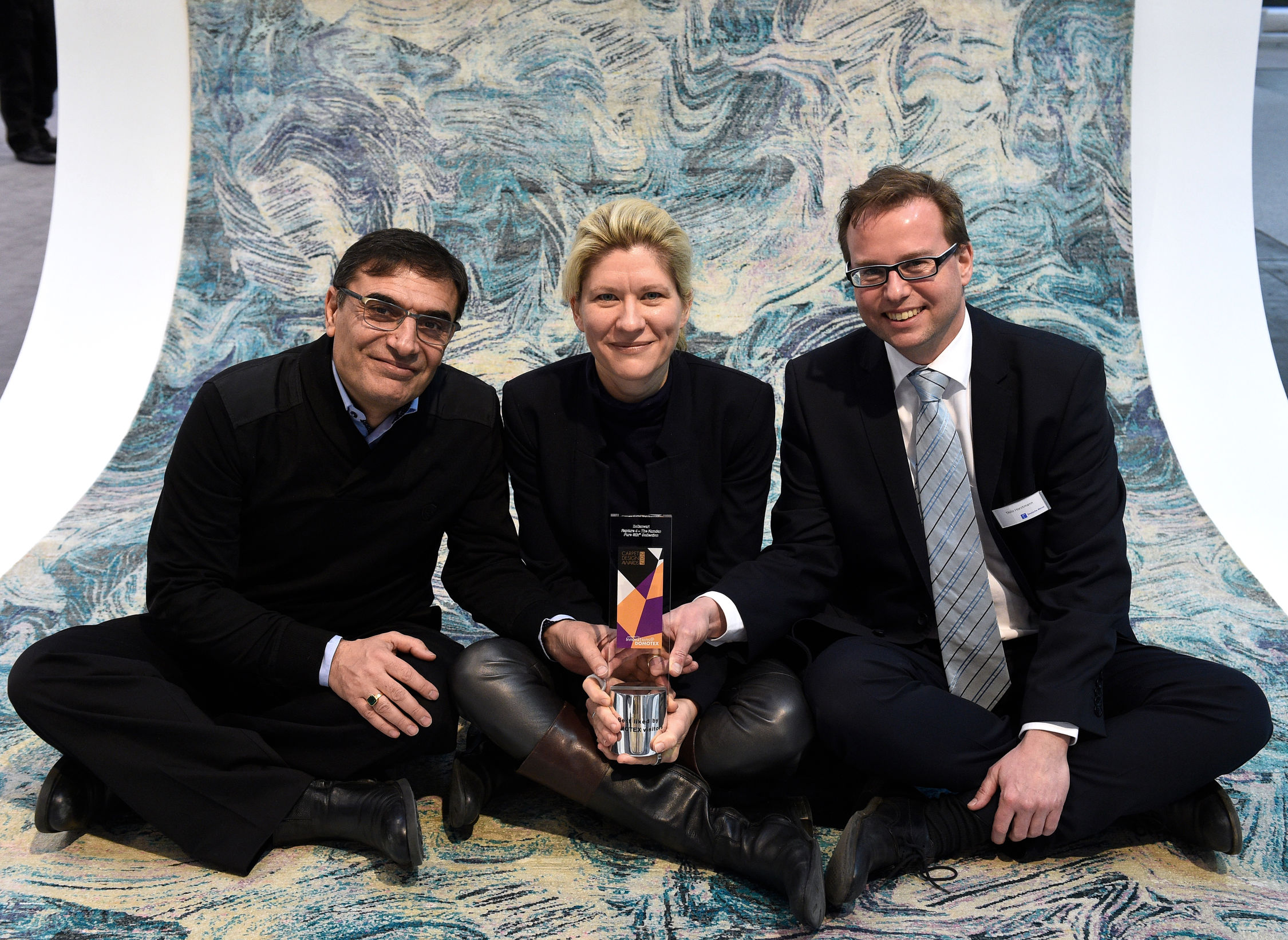 www.zollanvari.com in der Kategotie 3 – « Bestes modernes Design Deluxe ». Im Bild: Reza Zollanvari, Group Managing Director Reza Zollanvari, Zollanvari AG, Lucy Upward, Senior Editor, Hali Publications, Thilo Horstmann, Deutsche Messe